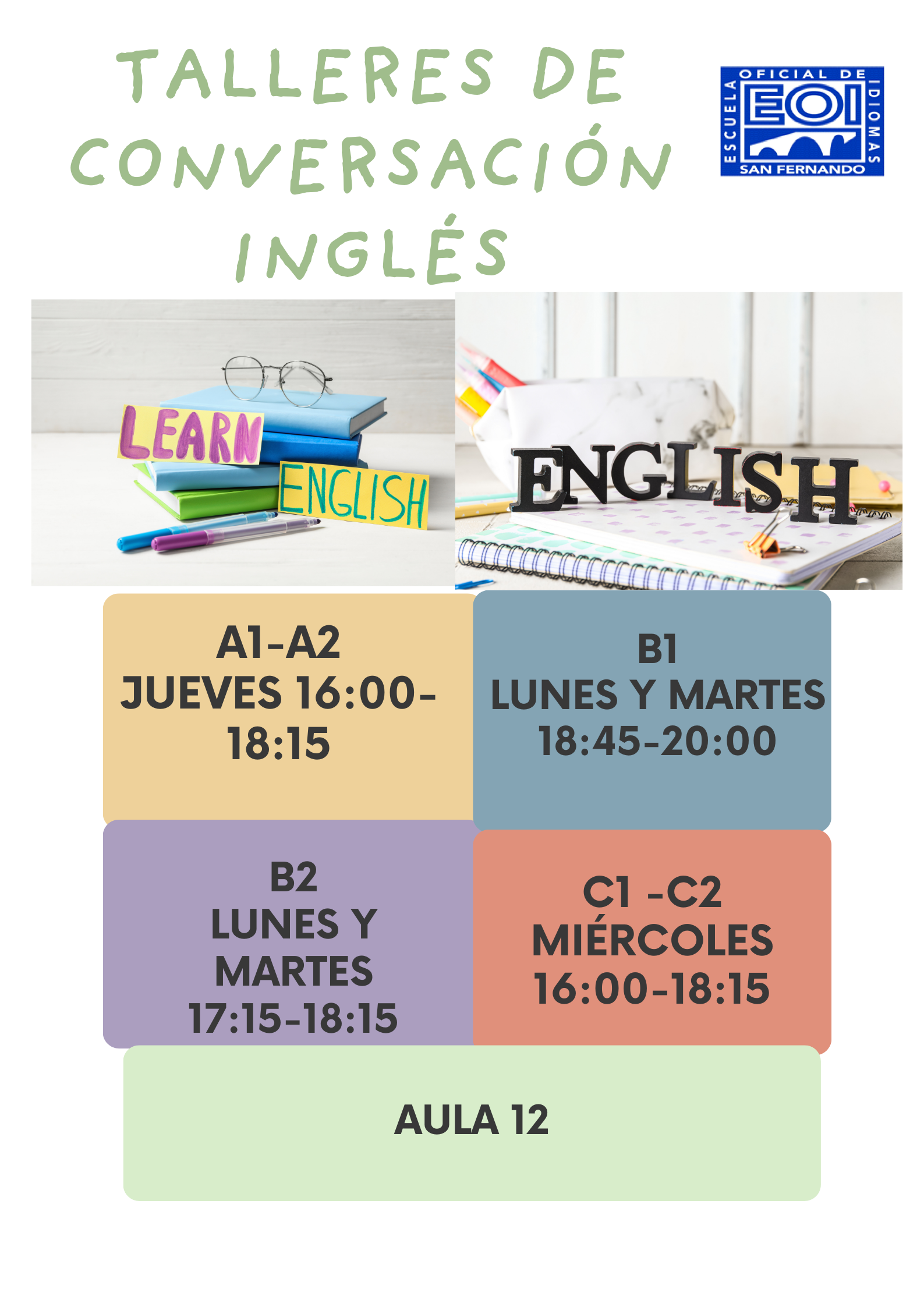 Durante este curso y durante tiempo limitado se ponen en marcha los talleres de conversación de inglés en nuestro centro. Son talleres voluntarios y de asistencia libre: cualquier alumno o alumna de inglés puede acudir al taller que corresponda a su nivel oficial de matrícula.